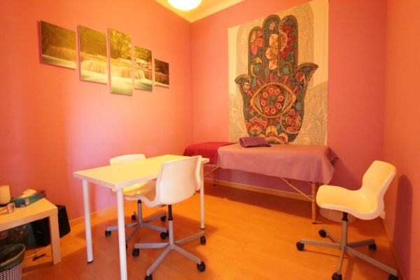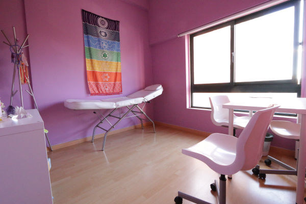 Gabinete equipado com marquesa , mesa e cadeira para as diversas terapias